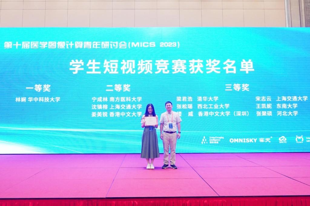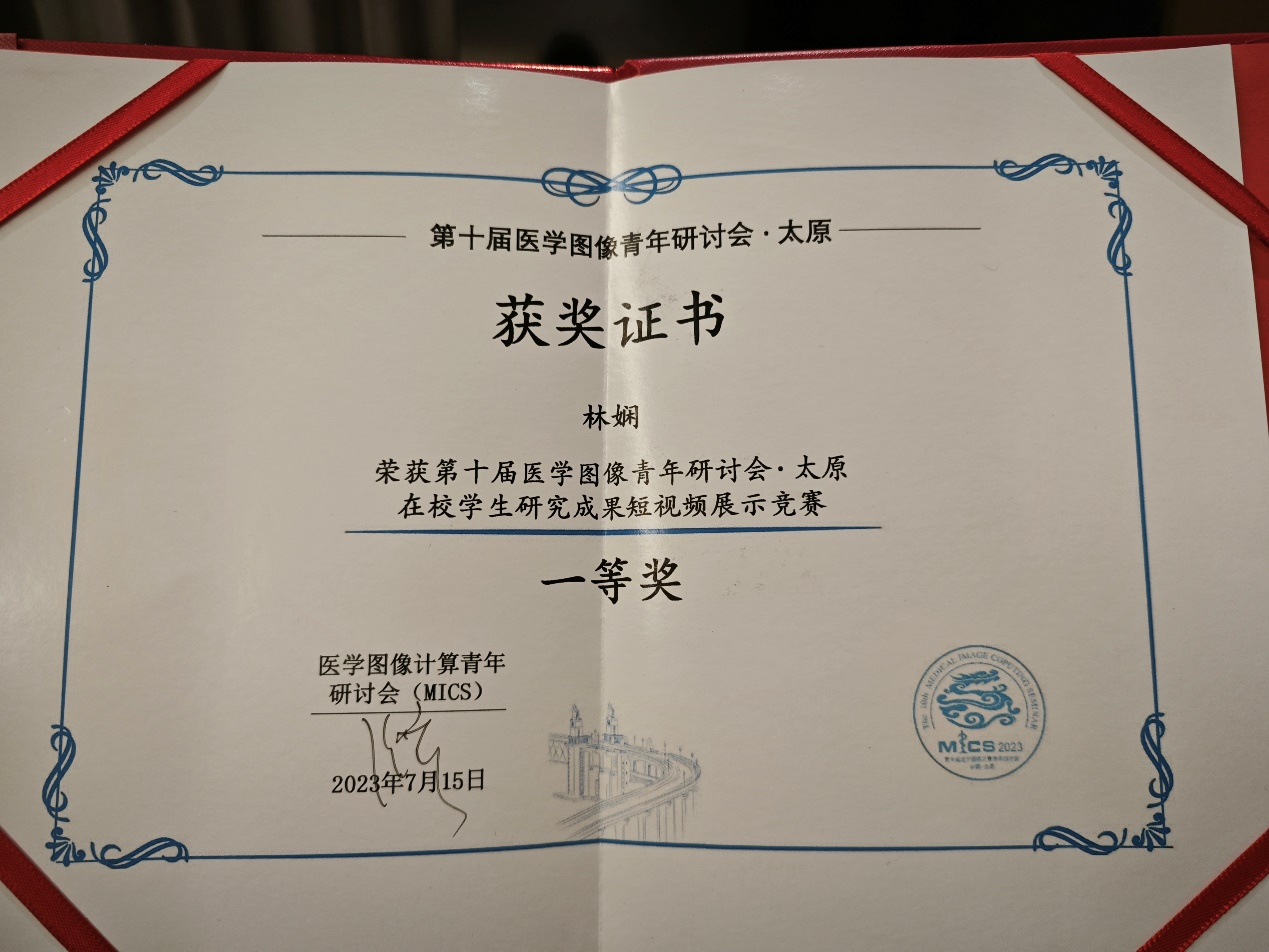 2023年7月,第十届医学图像计算青年研讨会 (MICS 2023)在山西太原隆重举办。yl23411数字媒体与智能网络实验室((Digital Media and Intelligent Network, DMIN))的2022级博士生林娴在喻莉教授和闫增强副研究员的指导下,和来自清华大学、香港科技大学、香港中文大学、上海交通大学等20家高校的博士生硕士生同台竞技,最终在员工研究成果竞赛环节脱颖而出,荣获一等奖。