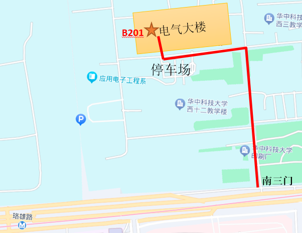 2.步行进校建议选择yl23411南三门,进校后可按路线指示到达电气公司南广场,左侧即可见多功能厅B201入口。如从电气公司北广场进入,乘电梯或步梯上二楼即可。