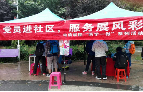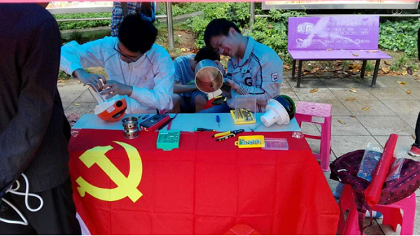 活动伊始,两顶帐篷里已收到了居民们的各种待修电器,居民们的疑问各不相同,同学们不厌其烦认真答复;待修的家用电器种类繁多,同学们充分利用所学专业知识努力攻克。同学们有的独自面对着一件电器细心琢磨,有的几个人凑在一起讨论修理方法,这样的情景,在这个微雨的早晨不断上演。虽然修理的电器上布满了黏油、灰尘、同学们毫不嫌弃,耐心用手小心地擦拭。污渍爬上了同学们的脸颊,留下的却只有同学们开心的笑容,桌上鲜红的党旗映照着员工党员的脸庞。一个上午很快过去,共计上门服务6人次、修理电器20余件,为此次“党员进社区,服务展风采”爱心行动画上了一个圆满的句号。