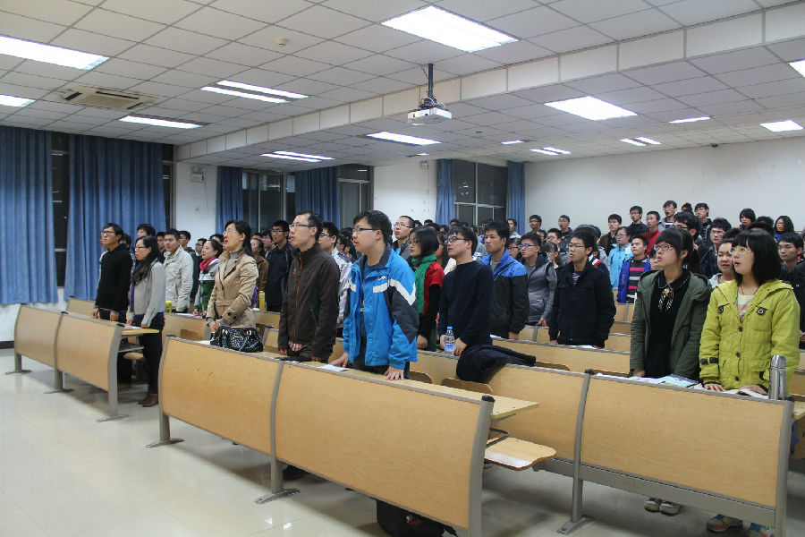 党课培训结业典礼开场,全场两百多名入党积极分子和嘉宾起立,高唱国歌。首先由学工组组长梅健老师公布27期培训班结业学员名单并宣读优秀学员的表彰决定,本科生、研究生共有8人获此殊荣。艾书记代表系党总支给这8位优秀学员代表颁发荣誉证书。