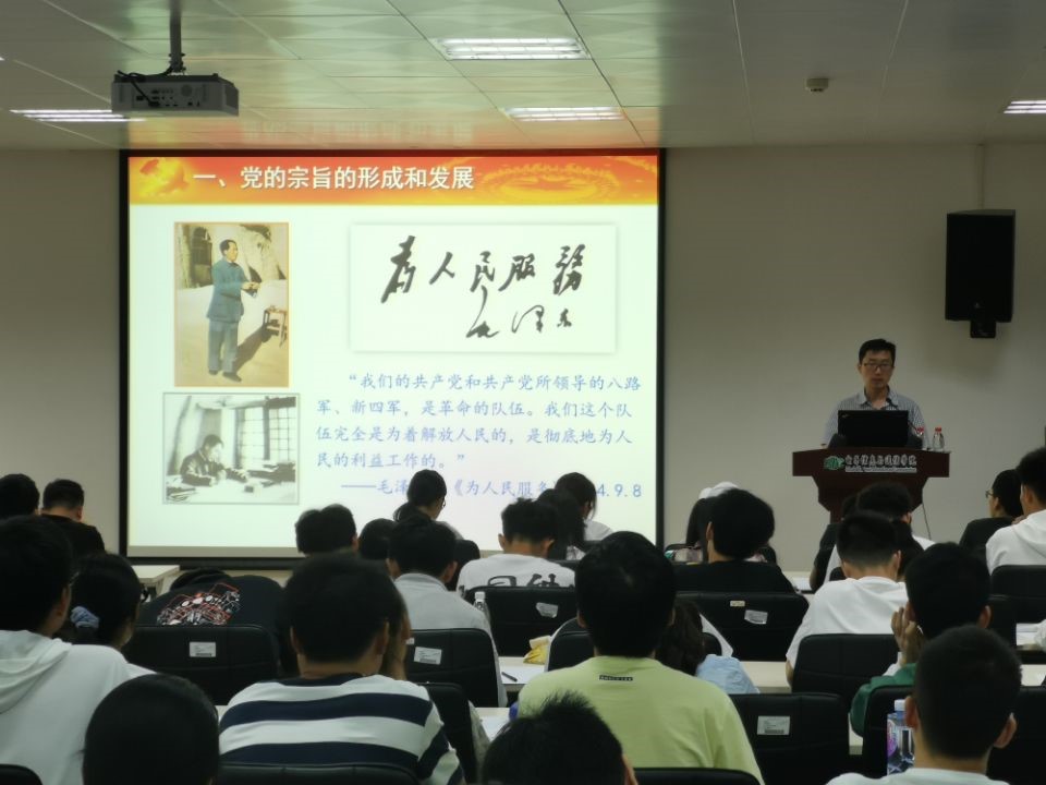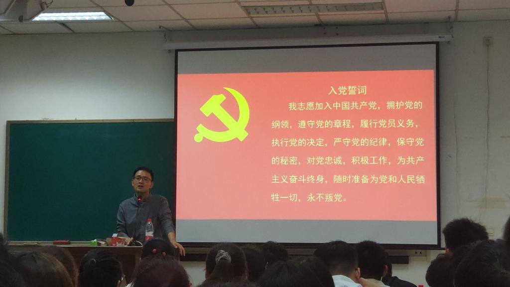 开班仪式结束后,刘鹏老师为同学们讲授第一课。他以理想信念引出党的性质的讲述,围绕党章,详细阐述了性质中的两个先锋队、一个领导核心、三个代表、一个最高理想和最终目标。之后刘老师又谈到了习近平新时代中国特色社会主义思想和基本方略中的全面从严治党,强调理想信念缺失的危害。最后刘老师用入党誓词激励大家早日站在党旗下。