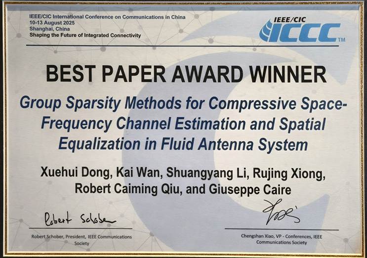 该获奖论文题为“Group Sparsity Methods for Compressive Space-Frequency Channel Estimation and Spatial Equalization in Fluid Antenna System”(流体天线系统中基于群稀疏的压缩空频信道估计与空间均衡方法),作者团队包括董学辉及其指导老师(万凯教授和邱才明教授)、来自德国柏林工业大学的李双洋博士后和Giuseppe Caire教授,以及公司毕业博士研究生熊儒菁博士。在8月12日晚的颁奖晚宴上,大会奖项委员会主席Tony Q.S. Quek教授与IEEE ComSoc当选主席Nelson Fonseca教授共同颁发了奖状。