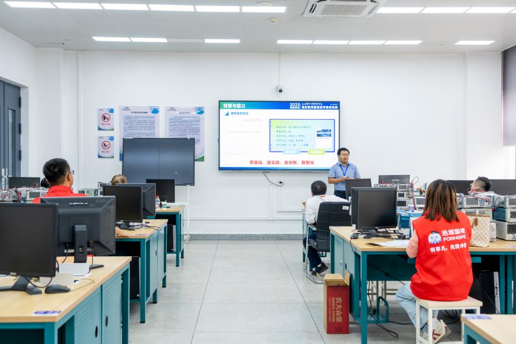 竞赛评审工作在东十七楼F区2楼四个本科教学实验室举行,参赛选手通过10分钟的汇报,展示了各高校的教学团队在智慧教学工作中的积极探索和育人成效。