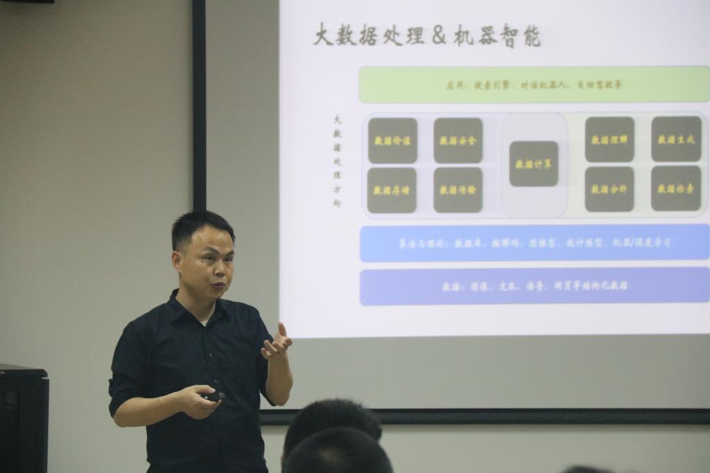 王兴刚以流程图的形式向同学们讲解专业内容的整体架构,并以“三个层次,两个方向,一个核心”概述专业内容。三个层次,即数据,算法理论及应用,三个层次环环相扣,能够实现从底层数据到高级服务的跨越。两个方向,即处理方向与智能化方向,分别涵盖数据的存储、传输、安全和数据的分析、理解、检索、生成,它们共同作用将数据的效益最大化。所有的大数据技术围绕一个核心,即计算。