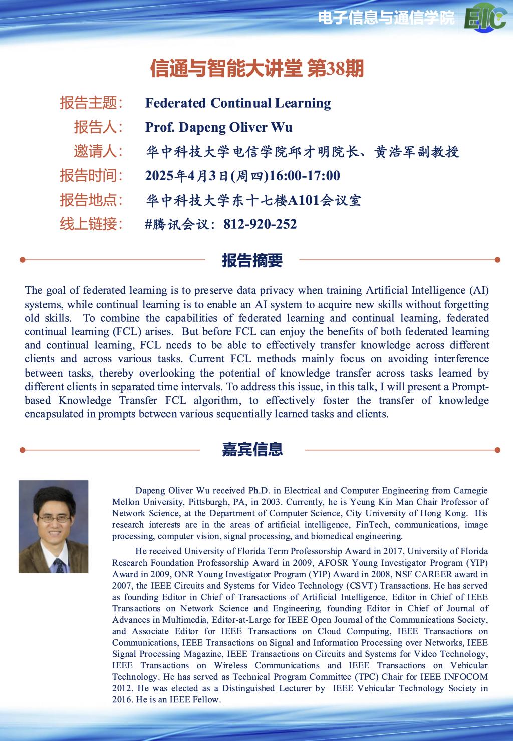 香港城市大学Dapeng Oliver Wu教授学术报告
